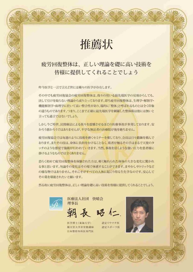 しかし、疲労(特に内臓の疲労)が蓄積すると身体がゆがみ、体液の循環が悪くなり、痛みやコリ、しびれが起こります。「疲労=歪み」であり、疲労は歪みに比例します。