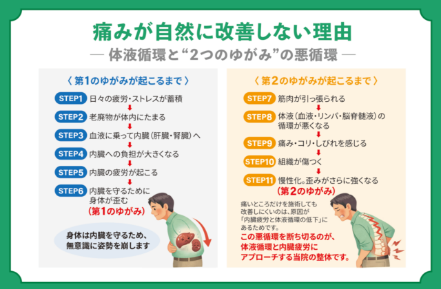 | 1:日々の疲労・ストレスが蓄積する ああああ⇓ 2:老廃物が体内にたまる ああああ⇓ 3:老廃物が血液に乗って内臓に届く ああああ⇓ 4:内臓への負担が大きくなる ああああ⇓ 5:内臓の疲労が起こる ああああ⇓ 6:内臓を守るために身体が歪む |